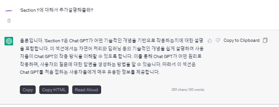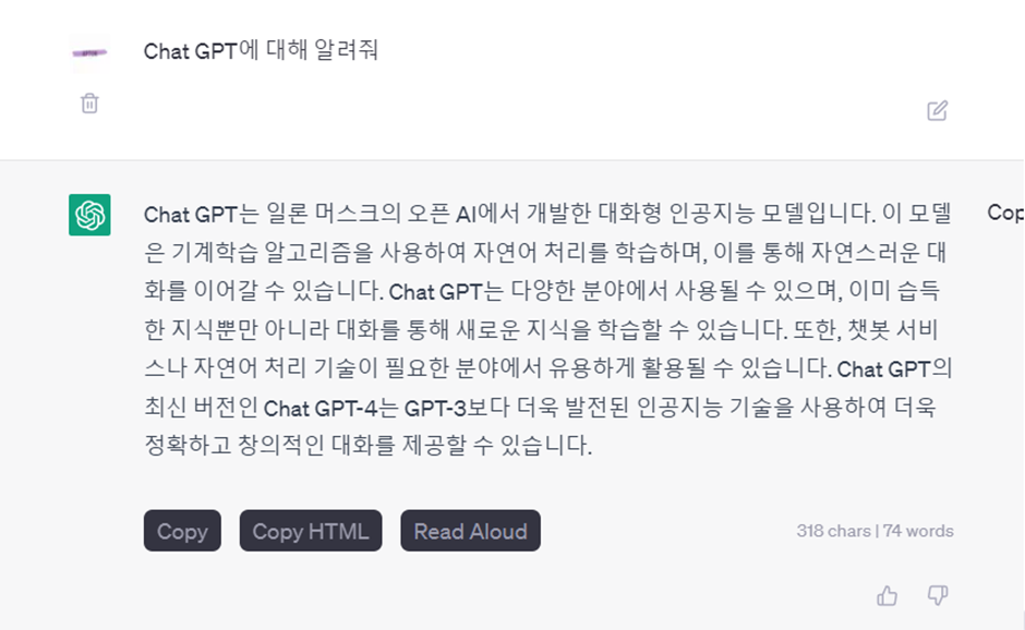 1. “Chat GPT에 대해 알려줘”라고 입력하면 다음과 같은 결과가 나옵니다.