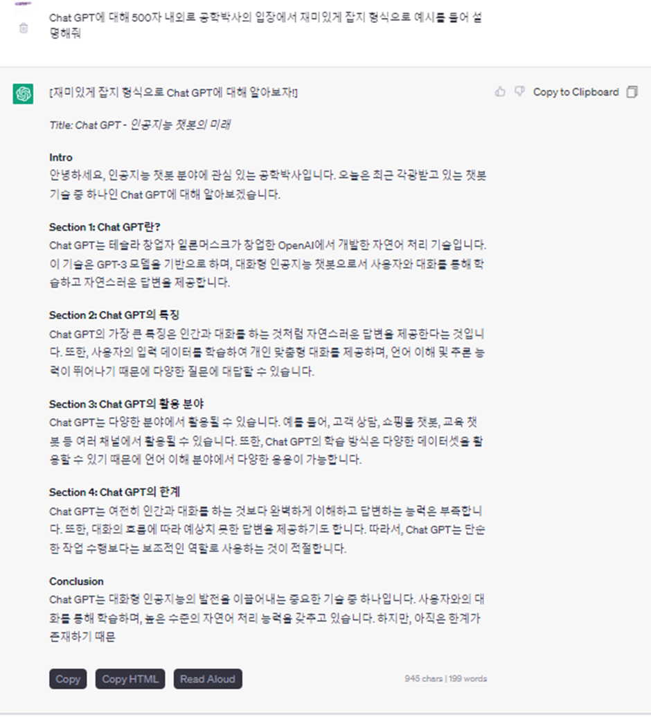 2. 하지만 “Chat GPT에 대해/ 500자 내외로/ 공학박사의 입장에서/ 재미있게/ 잡지 형식으로/ 예시를 들어/ 설명해줘”라고 입력하면 훨씬 더 정교한 답변을 받을 수 있습니다.
