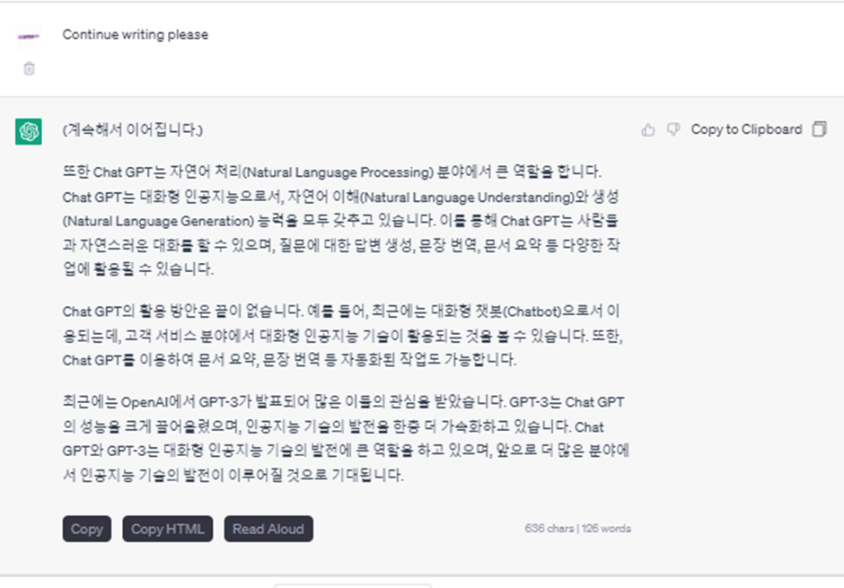 글자수를 크게 입력하면 답변이 중간에 끊길 수 있습니다. 그럴 때는 ‘Continue’라고 말씀해주시거나,