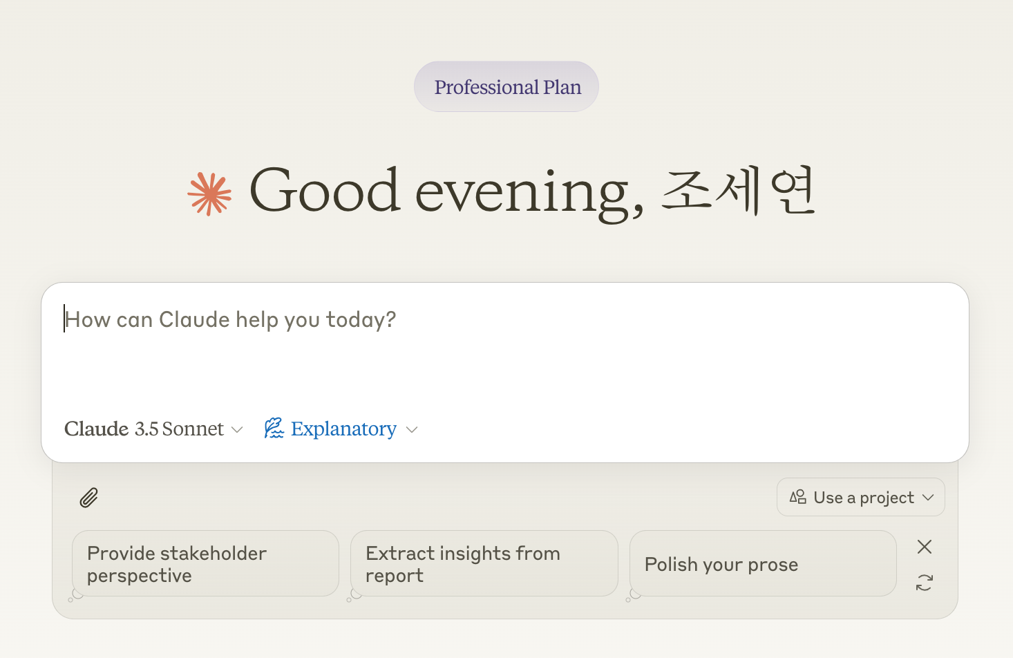 Claude의 인터페이스는 직관적이고 깔끔합니다.